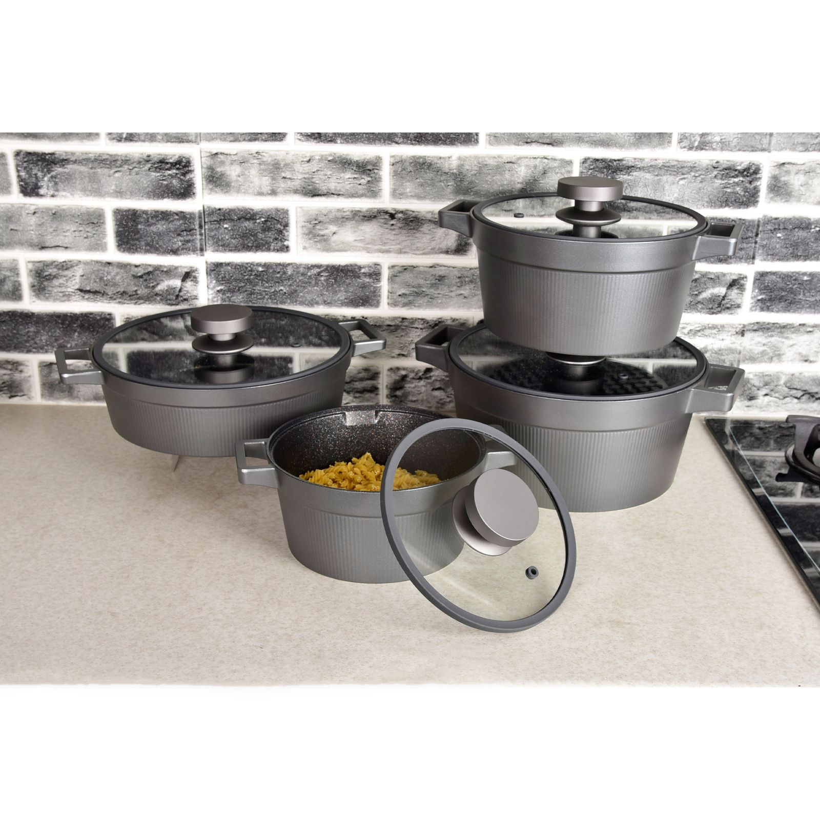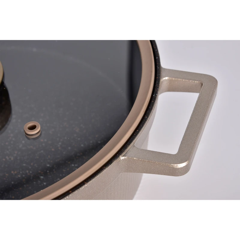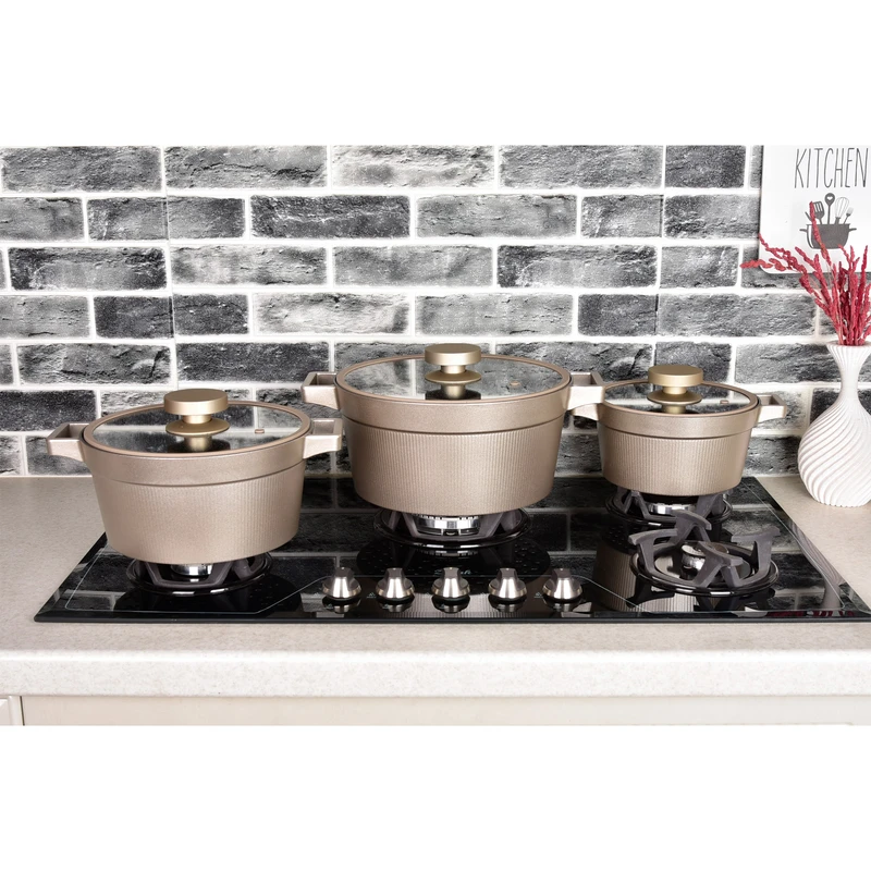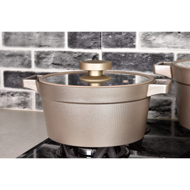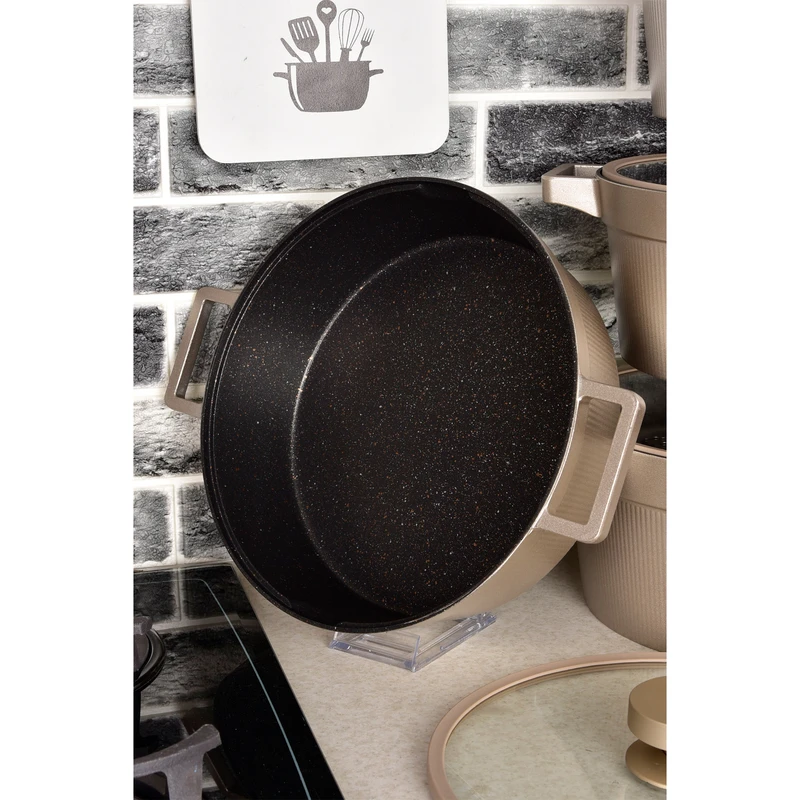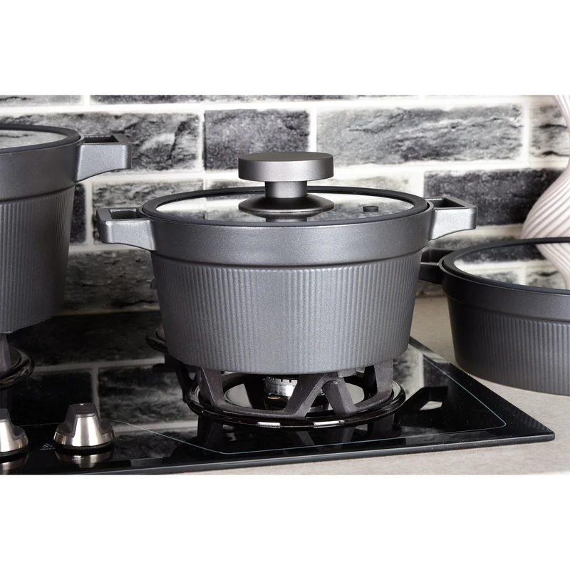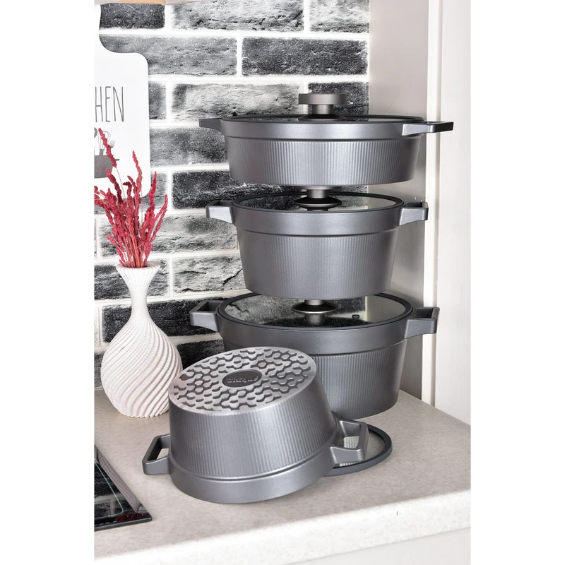 یک قابلمه سایز 20 و یک قابلمه سایز 24 یک قابلمه سایز 28 ، یک تابه دو دسته سایز 28 ، ساختار بدنه چدن ، درب پیرکس فلت