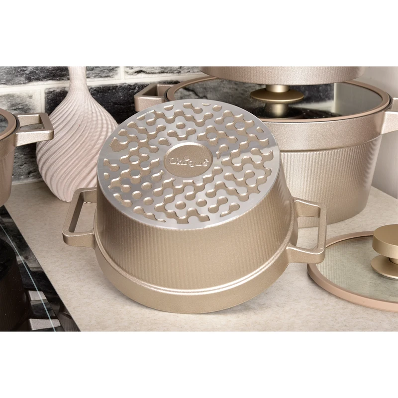 با سرویس قابلمه 8 پارچه یونیک مدل دیاموند کد 8506، تجربه‌ی آشپزی خود را به سطحی تازه ببرید! طراحی شیک و الماسی آن علاوه بر زیبایی، با پوشش نچسب و توزیع حرارت یکنواخت، شما را در تهیه غذاهای لذیذ یاری می‌کند. این سرویس مقاوم و بادوام، انتخابی ایده‌آل برای هر آشپزخانه مدرنی است. همین امروز خرید کنید و لذت آشپزی را دوچندان کنید!